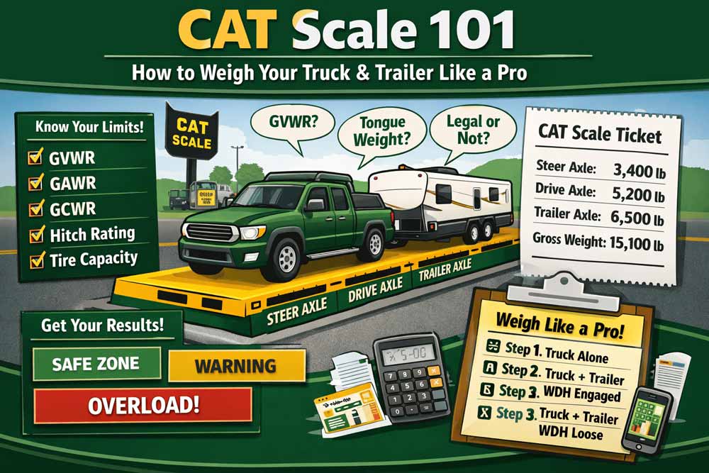 A quick CAT Scale stop replaces towing guesswork with real axle weights, true tongue/pin weight, and clear answers on whether your truck, trailer, hitch, and tires are actually within limits.